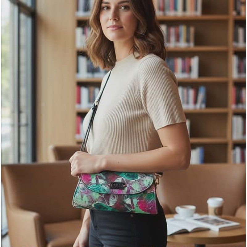 Elegant and practical, the floral crossbody bag by De Raggi is an ideal choice for women who want style and functionality in their everyday life. The unique floral pattern creates a modern and timeless aesthetic that easily matches many looks. The exterior of the bag is made of high-quality cotton fabric, which offers durability and a pleasant texture. Inside, it has a high-quality leather lining, which is breathable and absorbent, contributing to the better protection of personal belongings. For better organization, the bag has two internal pockets, one with a zipper for greater security and one open for easy access to small items.The bag has a detachable and adjustable strap, so that it can be worn comfortably crossbody, offering comfort and practicality in everyday use. The main opening is protected by a lid that closes with a magnetic clasp, ensuring security but also easy access to the interior. The metal De Raggi logo on the front completes the design, adding an elegant detail. Designed & Handcrafted in Greece.Dimensions: Height: 14 cm Length: 32 cm Width: 7 cm